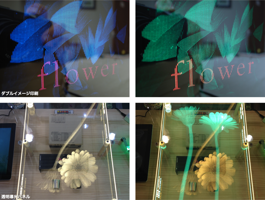 「ダブルイメージ印刷」は1枚のパネル状の印刷物に色彩の補色の働きによる切り替えによって、(通常は)2種類の図像を切り替えて表示させる事ができる印刷・表示技術。独自開発のストライプ型パターニングによって、単階調の図像だけでなく、グラデーション階調を持つ写真やイラストなど、より柔軟なイメージの表示が可能になった。これまでの領域にとらわれない、これらの技術の新しい用途開発に積極的に取り組んでいきたい。