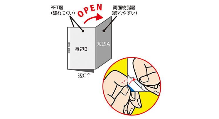 郵便法に準拠した形状で、3面はがきの中面に破れないフィルム加工を施す技術は一般的な製造方法では難しい弊社独自の加工技術となります。