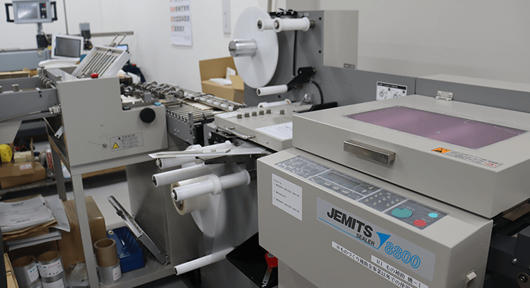 オフセット印刷機2台・オンデマンド印刷機2台(RICHO C9500 と C7500)・フィルム圧着加工機を保有。