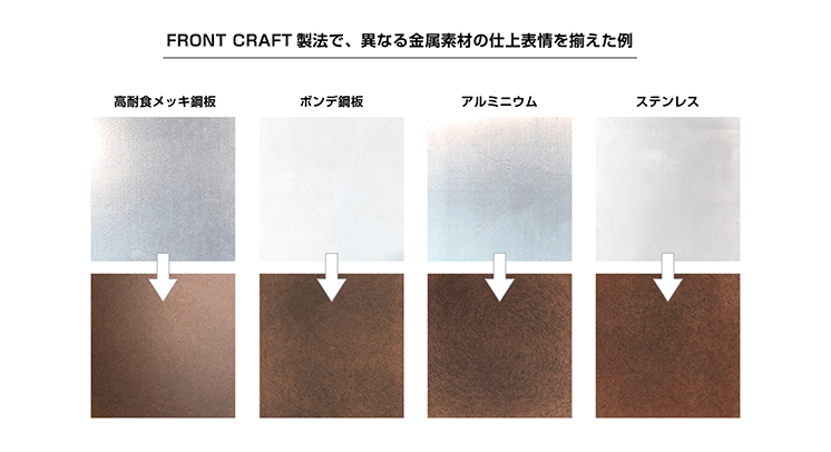 弊社は創業当初から耐候性鋼という耐食性に優れ、重厚感ある表情が特徴の素材の仕上を研究開発してきた歴史があります。しかし、この素材の仕上は作業が複雑かつ高価であり、その特性上使用箇所にも制限がありました。そこで、耐候性鋼仕上で培ってきた職人の技を活かし、メッキ鋼板やステンレスなどの多様な金属素材に対して、塗装や薬剤により生成した色層を熟練の職人が地金が出るまで手研磨し、独特な表情を生み出す当社独自の金属化粧仕上の特許技術「FRONTCRAFT®」を開発いたしました。この特許技術によって、塗膜と研磨目と地金を1度にすべて見せることが可能になり、一般的な塗装にはない奥行きとナチュラルなムラ感が深みのある表情を生み出します。
